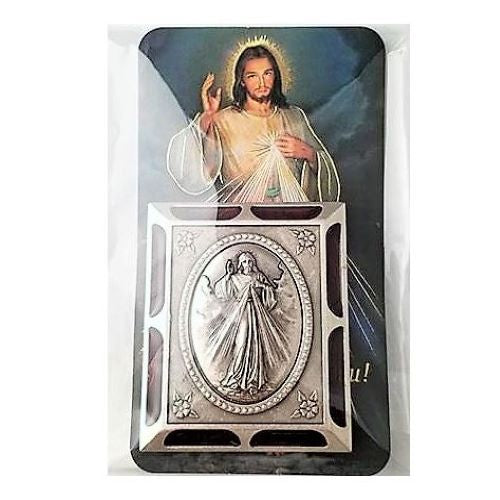 This divine Mercy pewter medal includes a holy card of Divine Mercy Jesus. The 2 inch by 1 inch pewter medal features translucent red accents. The ...