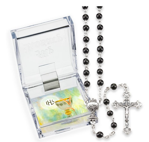 First Communion Rosary 5mm Black Glass Beads Gift Box