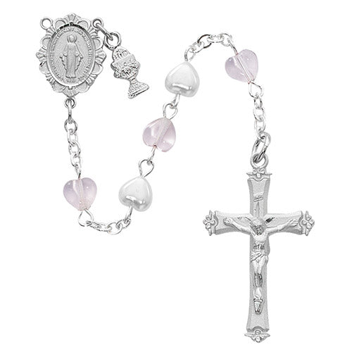 FIRST COMMUNION ROSARY with PINK & WHITE HEART BEADS