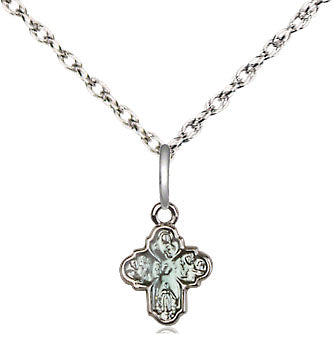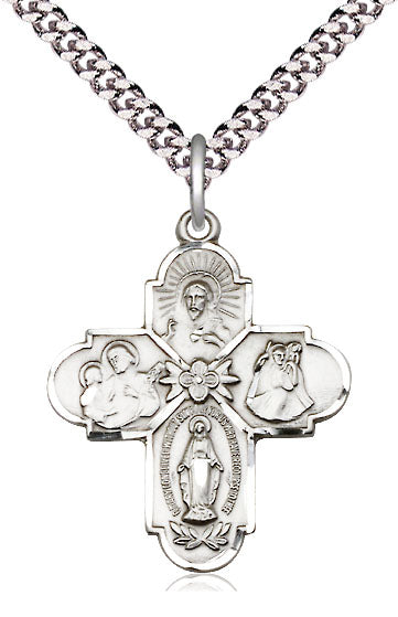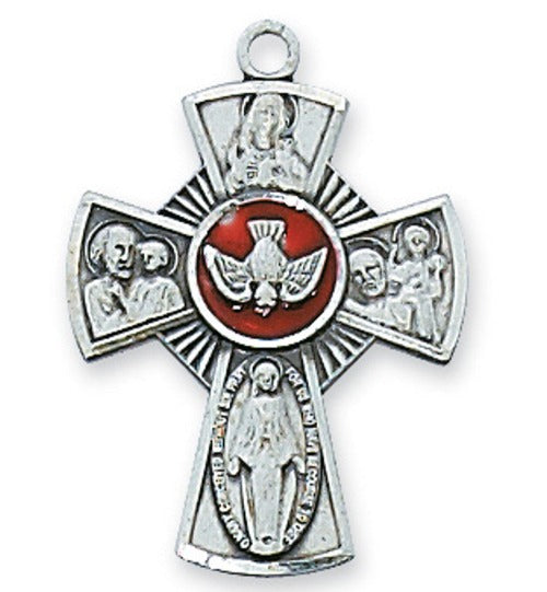 Sterling silver four way medal with red enamel holy spirit center. Comes on a 18" rhodium plated chain. Medal size: 9/10".