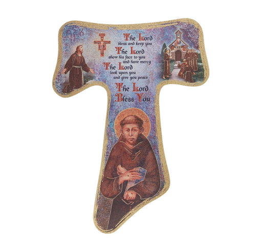 Gold Embossed Franciscan Tau wooden cross with Franciscan images and blessing. Size: 5" Made in the Hungary.