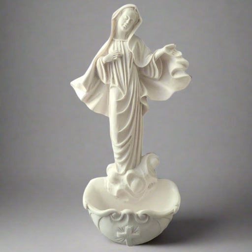 White Madonna and Child Holy Water Font features a carved marble look. Materials: Resin/stone Mix.