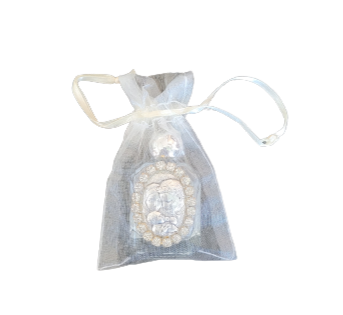 This charming Holy Water Bottle has a medal of the Holy Family framed in Swarovski crystal on the front and a twist top. Size: 2" x 1.5" x .75" Ma...