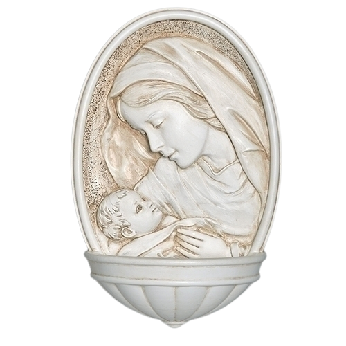 7.75" arched Holy Water Font featuring Madonna and Child with beautiful blue veil. Materials Polyresin Dimensions 7.75"H