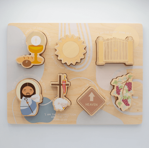 Teach children the seven “I am” statements of Jesus from the Gospel of John with this 8 piece wooden puzzle! This beautiful wooden puzzle helps de...
