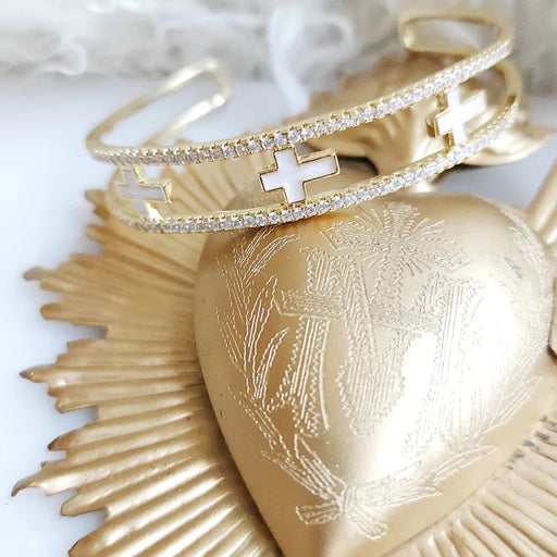 This stunning cuff showcases a crafted CZs set amidst lustrous cream enamel crosses. Expertly crafted in durable 18k gold-finish over brass, marve...