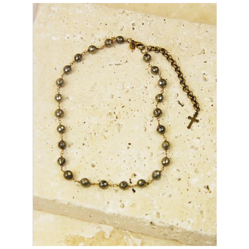 Luminary is a chain necklace made with faceted pyrite beads with antique bronze wire. A lobster clasp and extender chain increase it to your desire...