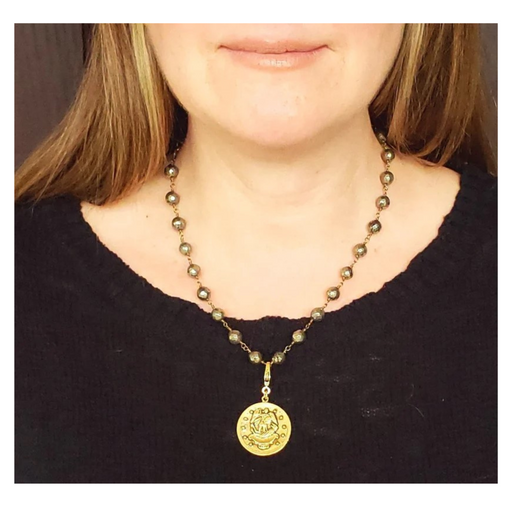 The Luminous necklace has silver seed beads surrounding a cast bronze medal with a tiny crystal drop. A guardian angel and child are depicted on th...