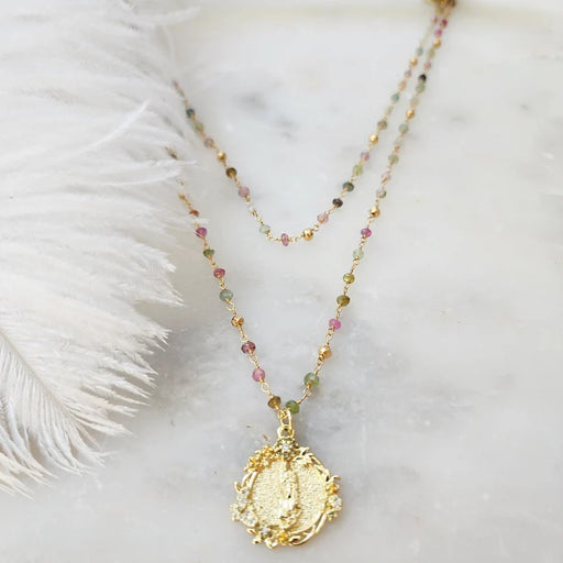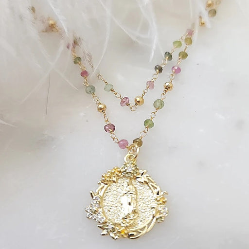This elegant multi-tourmaline rosary necklace features a double strand, with the longest measuring 18.5 inches. It is beautifully accented by a gol...
