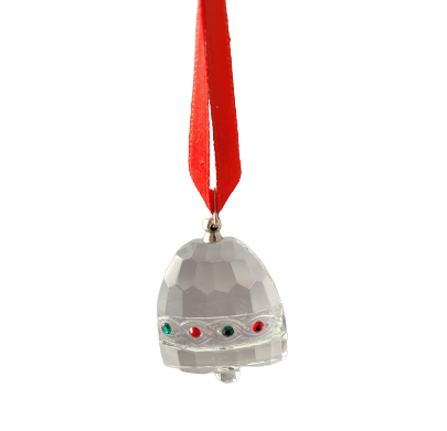Lovely faceted glass bell ornament is accented with alternate green and red crystals set in a cable design. 1.5” high. Comes on a red satin hanger.