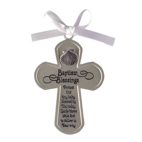 3" Cross with white ribbon. Silver enamel finish. On Front: Baptism Blessings: Protect this tiny baby, blessed by You today. Guide these little fe...
