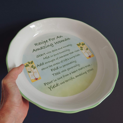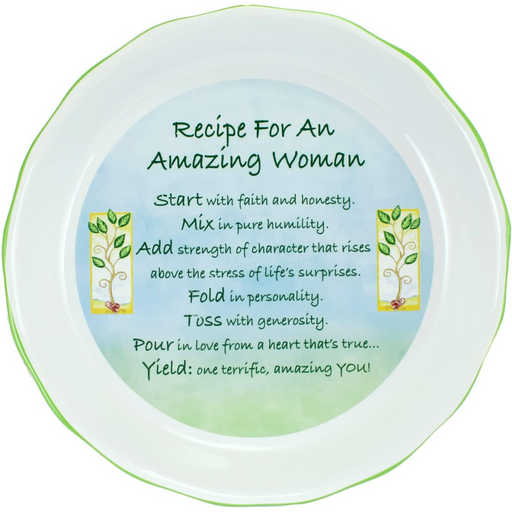11 inches round ceramic pie plate. Front Reads: "Recipe for an Amazing Woman. Start with grace and honesty. Mix in pure humility. Add strength of c...