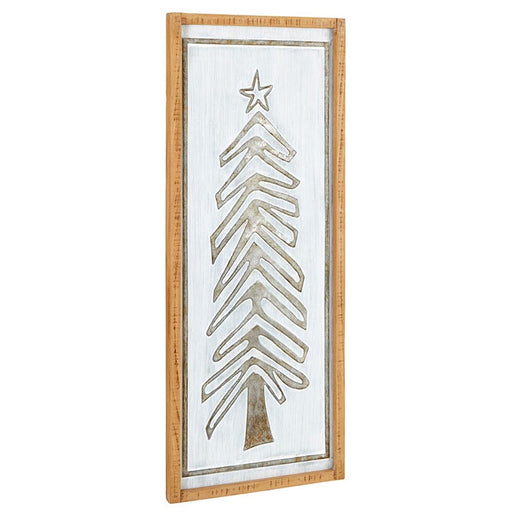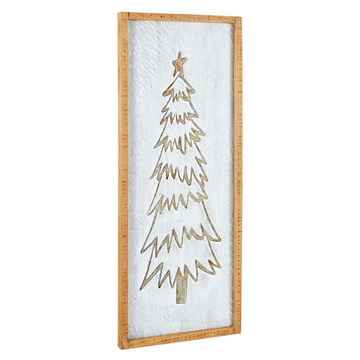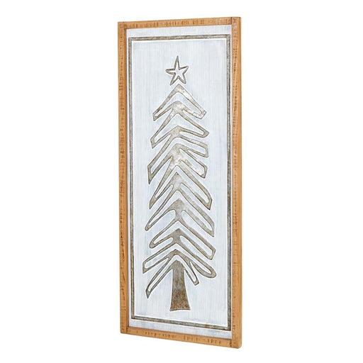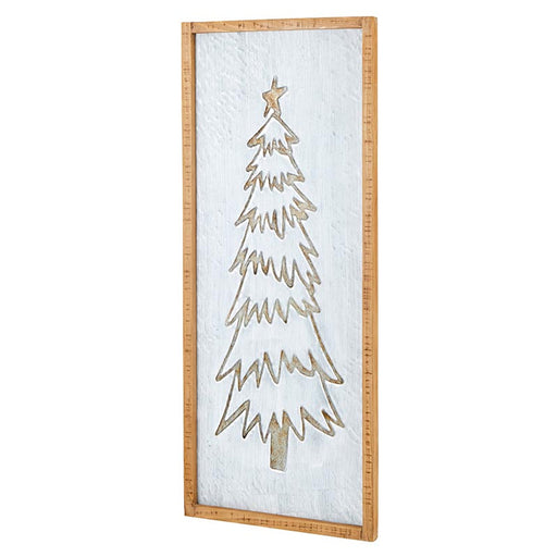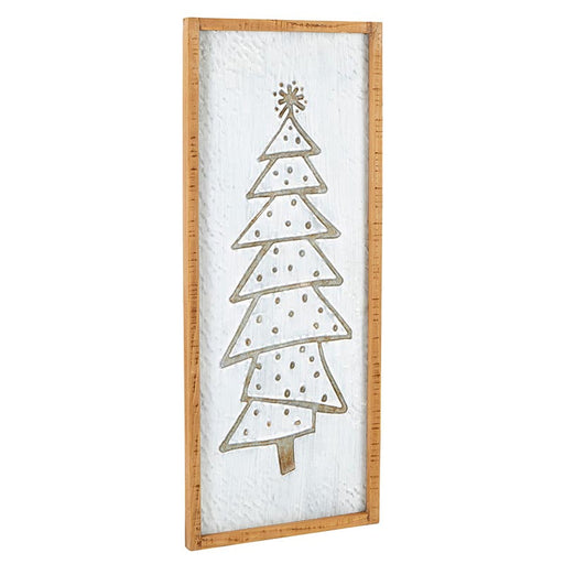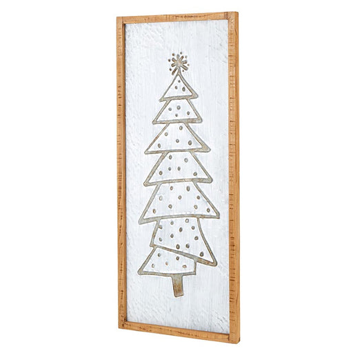 Celebrate the Holiday season with this galvanized metal Christmas tree sign! Wood frame Sawtooth hanger on back White washed galvanized metal Pack...