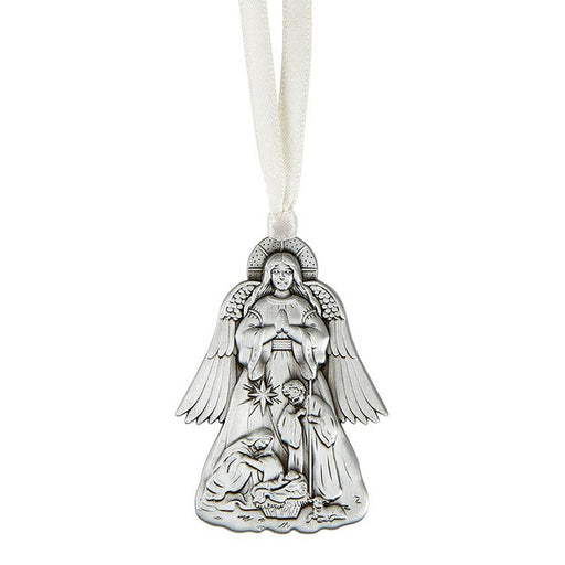 Add inspiration to your Christmas decor with this antique ornament. Features an antiquated silver finish Angel image with the Holy Family on the f...