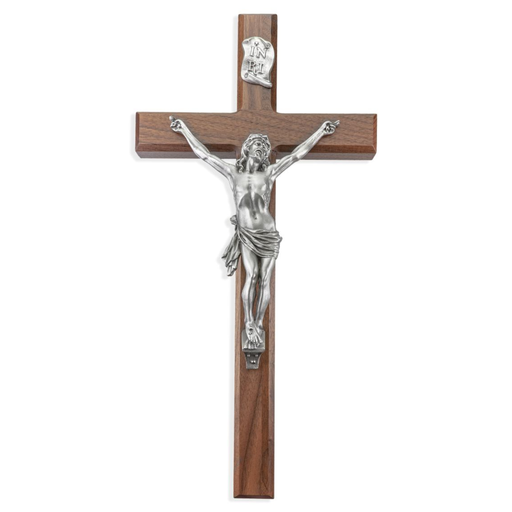 Details 10" Deluxe Furniture Grade Solid Wood Crucifix in a lacquered Walnut finish Silver finish exquisitely detailed Jesus Corpus hand fi...