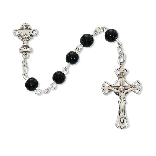 Lovely First Communion Rosary with black glass beads will be a treasured gift! The center is a chalice, with a beautiful crucifix, both in silver t...