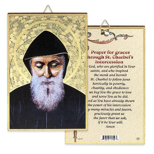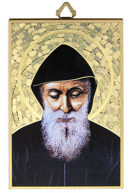 Italian Bright Gold Foil Mosaic Plaque has a vibrant image of St Charbel from Italian 'Bonella' collection on the front, and the beautiful prayer o...