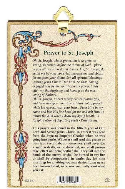 Italian Bright Gold Foil Mosaic Plaque has a vibrant image of St Joseph from Italian 'Bonella' collection on the front, and the beautiful prayer on...