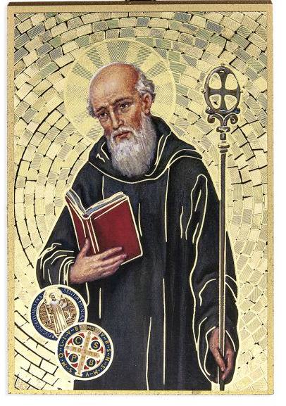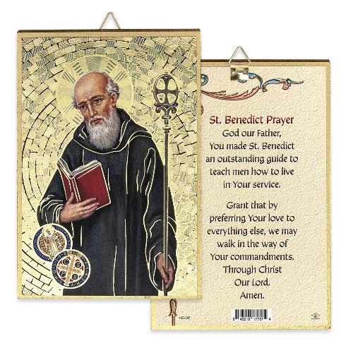 Italian Bright Gold Foil Mosaic Plaque has a vibrant image of St Benedict from Italian 'Bonella' collection on the front, and the beautiful prayer ...