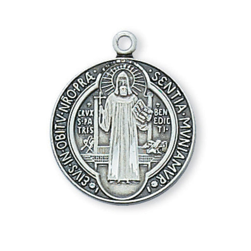 STERLING SILVER ST. BENEDICT MEDAL WITH 18" STAINLESS STEEL CHAIN. INCLUDES DELUXE GIFT BOX. PATRON SAINT OF PROTECTION FROM EVIL.DIMENSION: 3/4" LONG