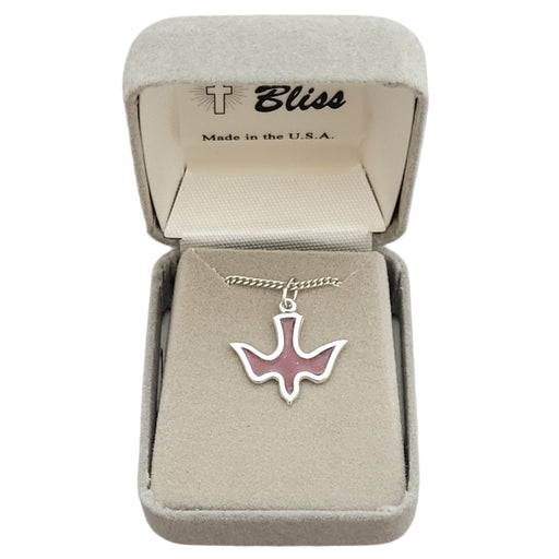 Holy Spirit in red enamel is die struck/silver plated, 0.75" high and comes on a 18" chain with a claw clasp.