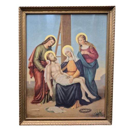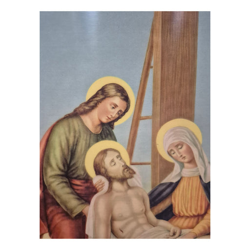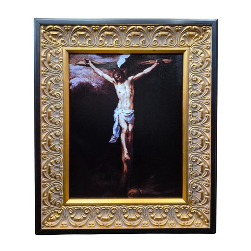 View full detailsThis image of the Crucifixion is on canvas and is famed in a Milano gold frame. The canvas size is 11" x 14".