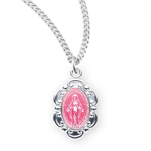 Child Miraculous Medal 0.6" SS Baroque Pink Enamel on 13" Chain