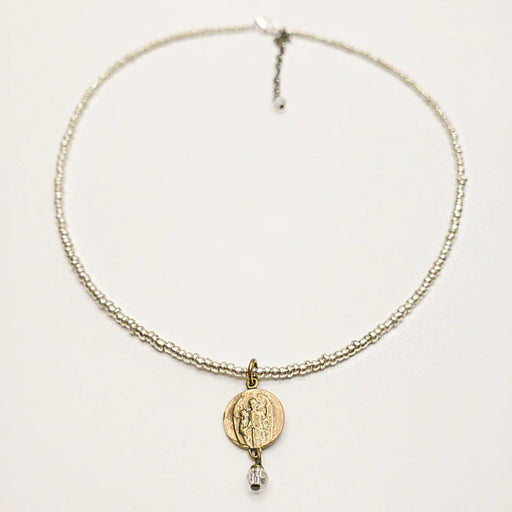 The Luminous necklace has silver seed beads surrounding a cast bronze medal with a tiny crystal drop. A guardian angel and child are depicted on th...