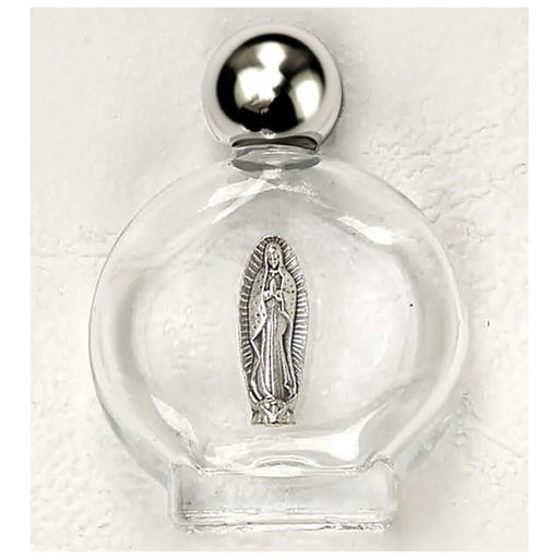 Decorative glass bottle, featuring Figure of Lady of Guadalupe. Approximately 2-1/4 inch tall, holds standard .5 fl oz Made in Italy