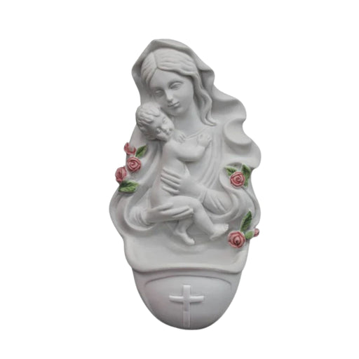 View full detailsMadonna & Child holy water font in white with pink roses 6.5". Made in Italy.