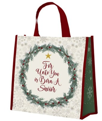 Christmas Tote bag in recycled nylon; pretty Christmas wreath design 13" square with 6" gusset; double handles Unto you is born a Savior; For gro...
