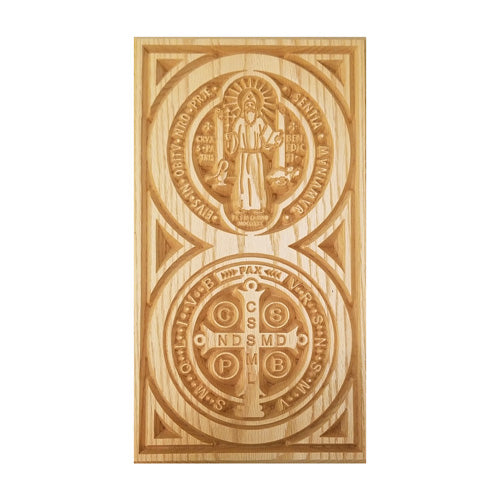 This wooden plaque depicts both sides of the St. Benedict medal. At 8.5” wide and 15” tall, it is perfect for someone with a strong devotion to St....