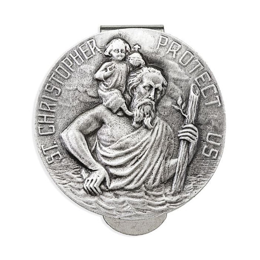 Antique Silver Finished St. Christopher Auto Visor Clip. Inscribed with: St. Christopher Protect Us. Size: 1 3/4" x 1 3/4" (44mm x 44mm)