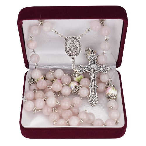 8MM rose quartz beads with capped 10MM pink floral ceramic Our Father beads. Silver oxidized crucifix and center. Comes in a gift box.