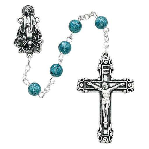 ROSARY - 8MM BLUE GLASS BEADS - OXIDIZED CRUCIFIX & MEDAL