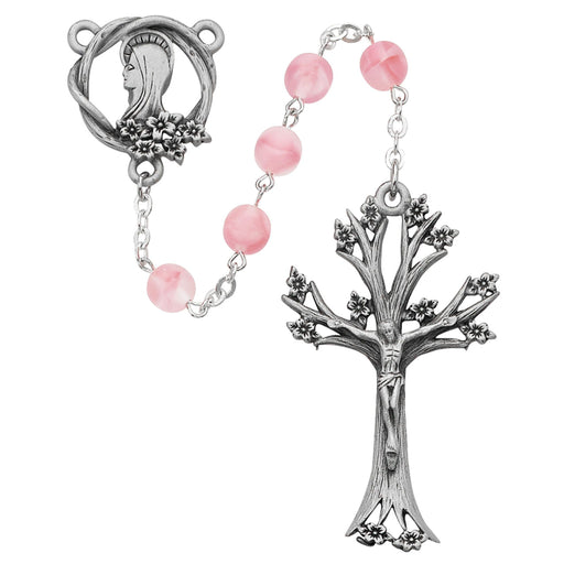 ROSARY - 7MM ROSE GLASS BEADS - DOGWOOD PEWTER CRUCIFIX AND CENTER