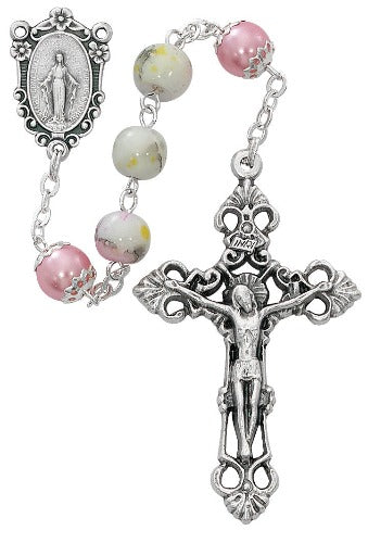 8mm Marbeline beads with pink capped "Our Fathers". Silver Oxidized Crucifix and Center. Comes in a box. Made in Italy.