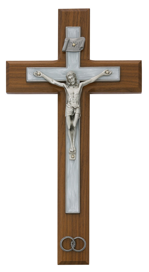 WEDDING CRUCIFIX 10" WALNUT WITH WHITE EPOXY OVERLAY AND RINGS
