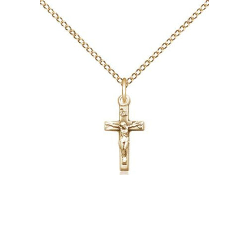 Crucifix Medal. Medal Measures 1/2-inch tall by 1/4-inch wide. Chain is 18 Inches in length Gold Filled Light Curb Chain with Lobster Claw Clasp.