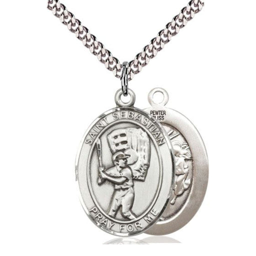 Pewter St. Sebastian / Baseball Medal. Medal Measures 1-inch tall by 3/4-inch wide. Chain is 24 Inches in length Light Rhodium Heavy Curb Chain wi...