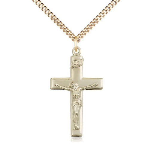 Crucifix Medal. Medal Measures 1 1/8-inch tall by 5/8-inch wide. Chain is 24 Inches in length Gold Plate Light Curb Chain with Lobster Claw Clasp.