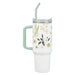 The top half of this stainless steel tumbler features a sleek white powder-coated finish, beautifully decorated with cream-colored meadow flowers and teal leaves. Right at the heart of its design, the sentiment is showcased in eye-catching gold-foiled letters.